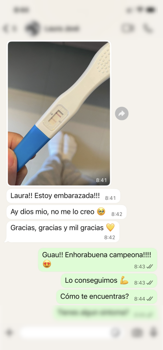 Contacté a Laura para mejorar y sanar mis ciclos menstruales con el objetivo de mejorar mi fertilidad, tenía spotting intermenstrual, ciclos muy cortos, reglas muy abundantes y dolorosas, cambios de humor muy extremos y dormía muy mal desde hacía casi 2 años. Fue una suerte poder ponerme en manos de Laura, agradezco su manera de ser, su método, su generosidad y pautas a seguir; al 4⁰ mes de haber iniciado la dieta, cambiado mis hábitos y seguir sus recomendaciones, el ansiado positivo llegó, y lo más importante, aprendí a leer mi cuerpo, conocer las fases de mi ciclo y sanarlo. Sin duda volveré a contactar a Laura en futuras ocasiones y no pararé de recomendarla a amigas y conocidas. Es un 10 de persona y agradezco haberme puesto en sus manos.